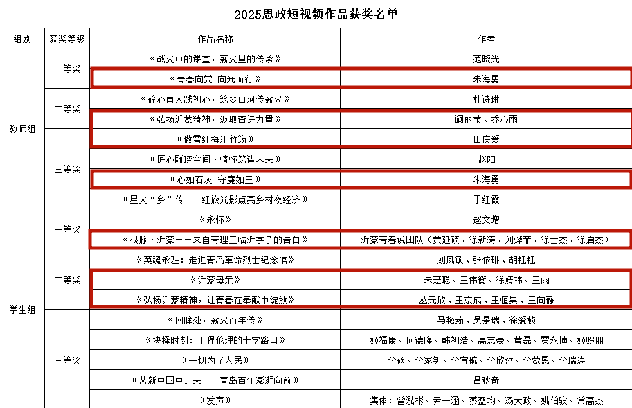 在2025年思政短视频评选中,土木与建筑工程系团总支书记朱海勇的作品《青春向党 向光而行》荣获教师组一等奖;管理工程系辅导员阚丽莹、乔心雨的作品《弘扬沂蒙精神,汲取奋进力量》荣获教师组二等奖;朱海勇的作品《心如石灰 守廉如玉》、基础部辅导员田庆爱的作品《傲雪红梅江竹筠》荣获教师组三等奖,土木与建筑工程系学生贾延硕、徐新涛、刘烨菲、徐士杰、徐启杰的作品《根脉·沂蒙——来自青理工临沂学子的告白》(指导教师:张晓华)荣获学生组一等奖;管理工程系学生朱慧聪、王伟衡、徐婧祎、王雨的作品《沂蒙母亲》(指导教师:何晓晴、阚丽莹)、管理工程系学生丛元欣、王京成、王恒昊、王向静的作品《弘扬沂蒙精神,让青春在奉献中绽放》(指导教师:阚丽莹、乔心雨)荣获学生组二等奖。