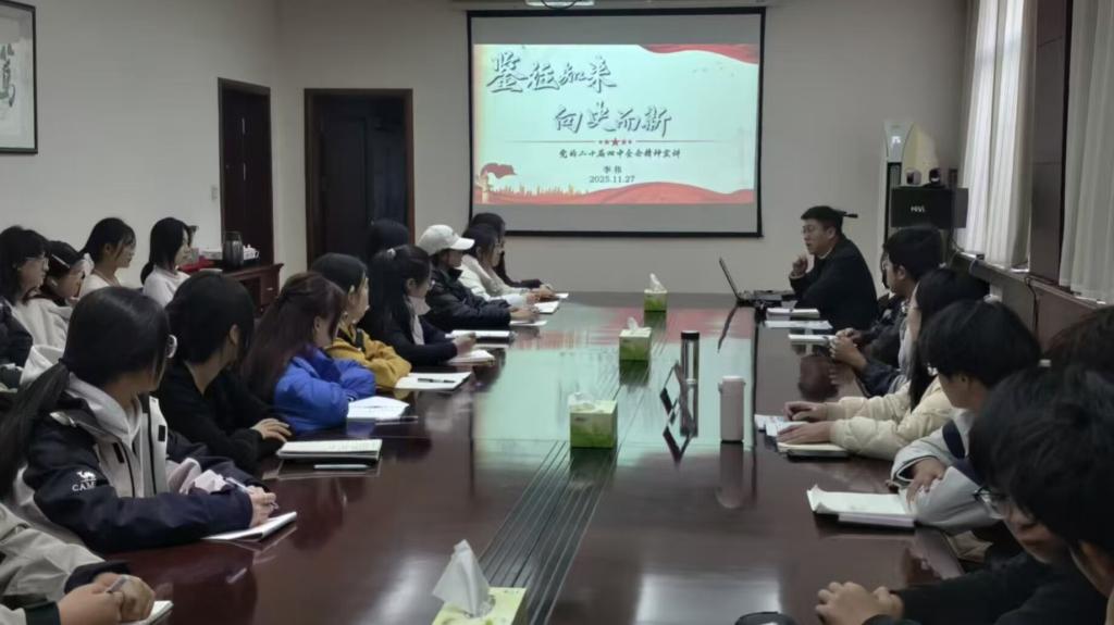 11月27日,统计252班“深学全会精神,情系学子心声”师生连心座谈会在办公楼202会议室举行。会上,李伟围绕党的二十届四中全会精神,以“鉴往知来向史而新”为主题作专题宣讲,深入解读新时代青年的使命担当,引导同学们深刻领会我国制度优势,坚定“四个自信”,自觉将个人成长坐标融入祖国发展大局,让理论学习既通俗易懂又入脑入心。互动环节,同学们踊跃分享学习心得,积极交流专业学习规划与校园生活适应等方面的困惑。现场氛围热烈融洽,为同学们明确成长方向、坚定前行信念注入了强劲动力。