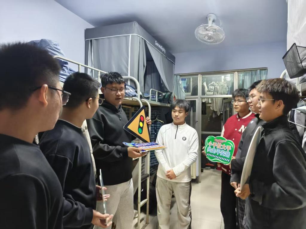 在宿舍区,“七号舍友”团队针对性开展电动车出行警示教育。“骑电动车闯红灯、逆向行驶、不戴安全头盔这些看似细小的行为,实则是引发事故的‘导火索’。”团队成员结合校园电动车出行常见隐患,向同学们细致讲解风险点,并分享实用安全防护技巧,引导学生摒弃交通陋习。