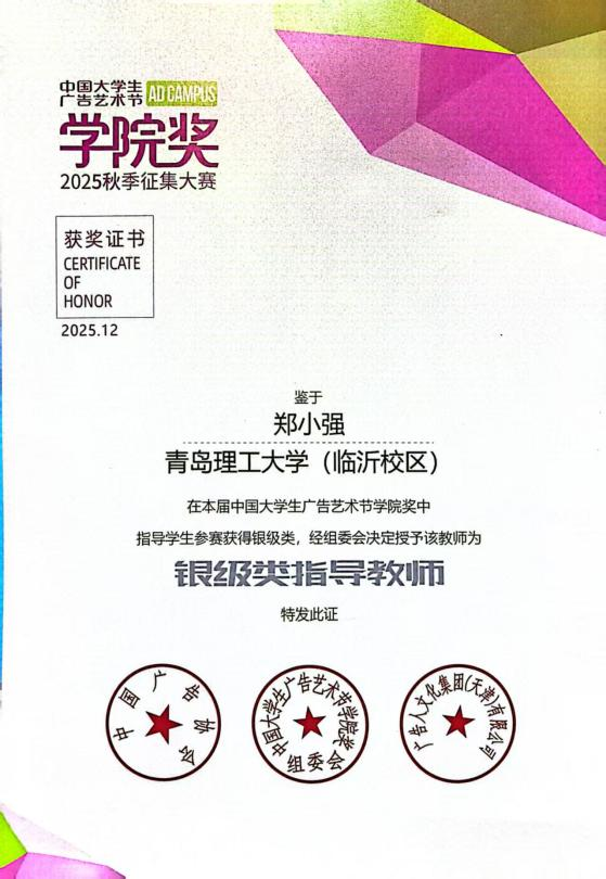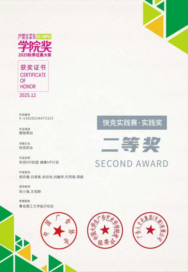 作为国内三大设计类赛事之一,本届学院奖设置企业命题、自由创作两大赛道,涵盖平面设计、漫画故事、影视广告、微电影、短视频、营销策划、广告文案7个竞赛类别。历经6个多月的实战创作、专家评审及现场答辩等环节,土木与建筑工程系环境设计254班谷昱衡、侯苏倩、代雨萌、刘馨然、栾欣怡、周越组成的团队(指导教师:郑小强、王冠群),凭借作品《快克ON校园 健康UP计划》斩获企业命题赛道国家级二等奖。郑小强获评银级类和二等奖指导教师;王冠群、江一获评二等奖指导教师;获奖团队成员还成功获得快克药业公司实习资格。
