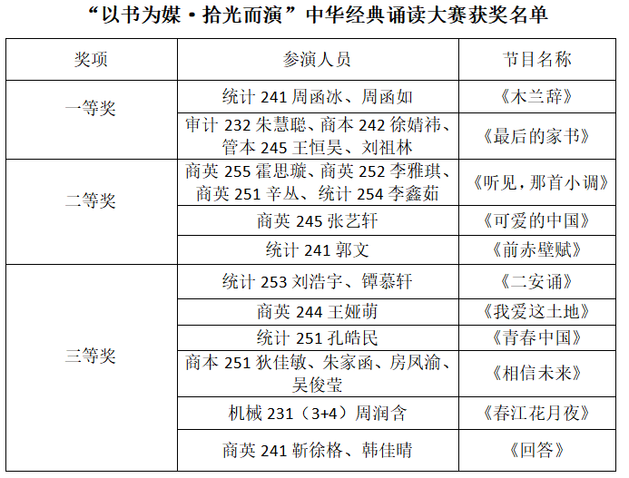 当晚,“以书为媒·拾光而演”中华经典诵读大赛决赛在大学生孵化基地报告厅精彩上演。历经初赛选拔与反复打磨,参赛选手以饱满姿态登台竞技,以诵读为桥、以声音为媒,演绎一篇篇传世经典。从意境悠远的古典诗词,到慷慨激昂的近现代诗文,作品主题丰富、内涵深刻,饱含家国情怀与青春理想。选手们情真意切、声韵铿锵,充分彰显中华优秀传统文化的独特魅力,生动展现当代大学生朝气蓬勃、奋发向上的精神风貌。经过激烈角逐,统计241班周函如、周函冰等同学的《木兰辞》等作品分获一、二、三等奖。