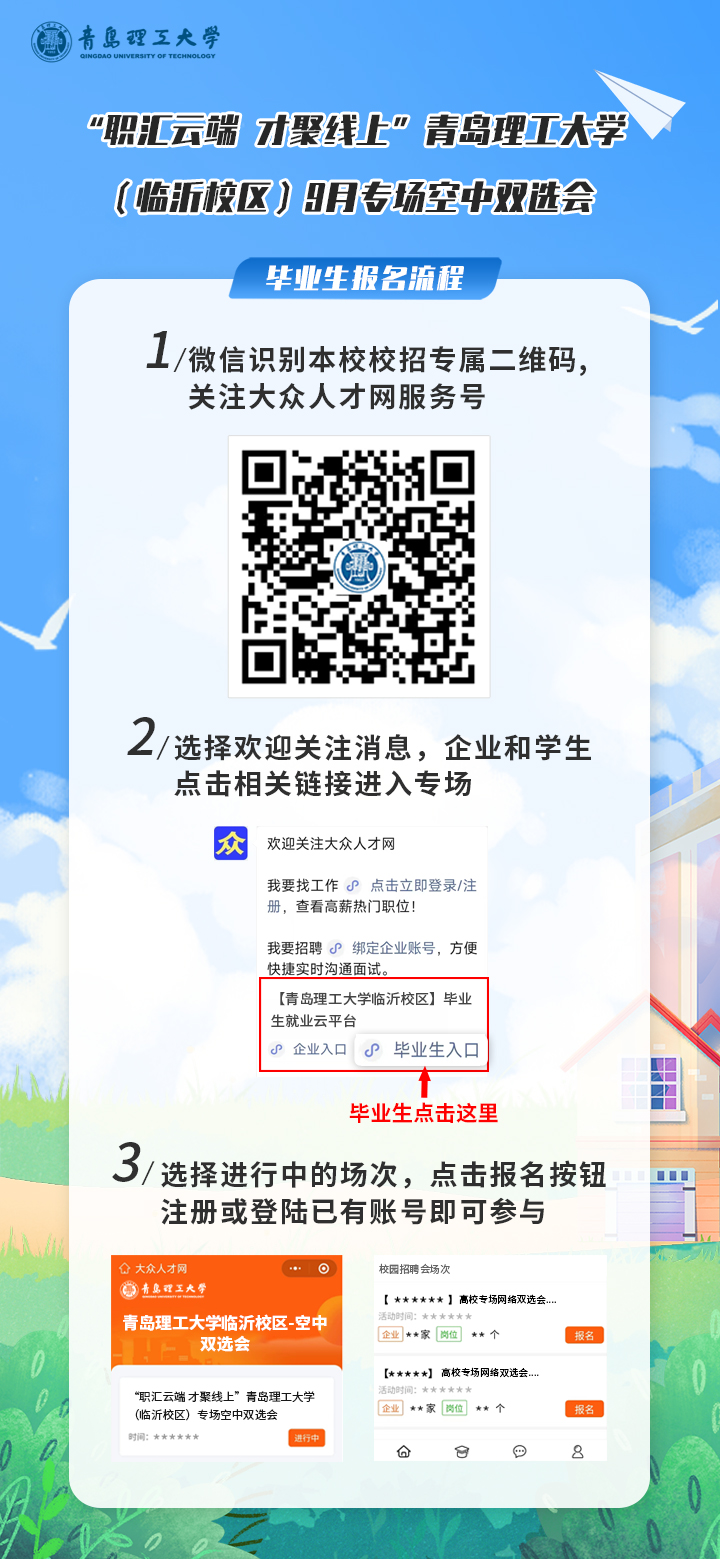 微信扫描页面下方双选会二维码或微信搜索“大众人才网”关注公众号,企业和毕业生分别点击相关按钮进入青岛理工大学临沂校区专场,点击报名按钮,注册或登录已有账号即可直接参与。